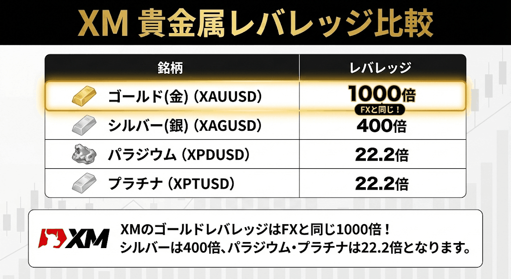 シルバーはレバレッジ400倍、パラジウムやプラチナは22.2倍となります。