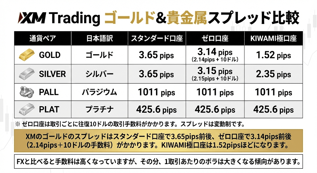 XMのゴールドのスプレッドはスタンダード口座で3.65pips前後、ゼロ口座で3.14pips前後(2.14pips+10ドルの手数料)がかかります。