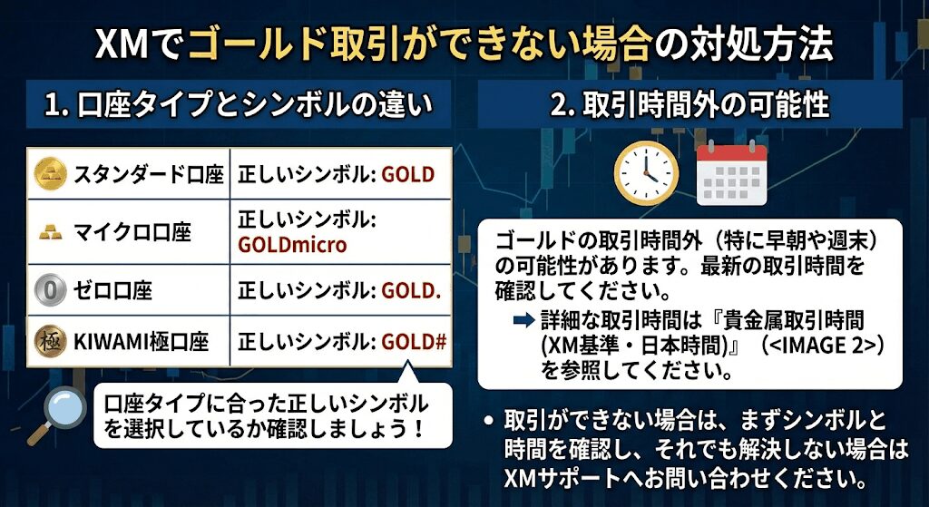 XMでゴールドの取引ができない場合は以下の2点の可能性があります。