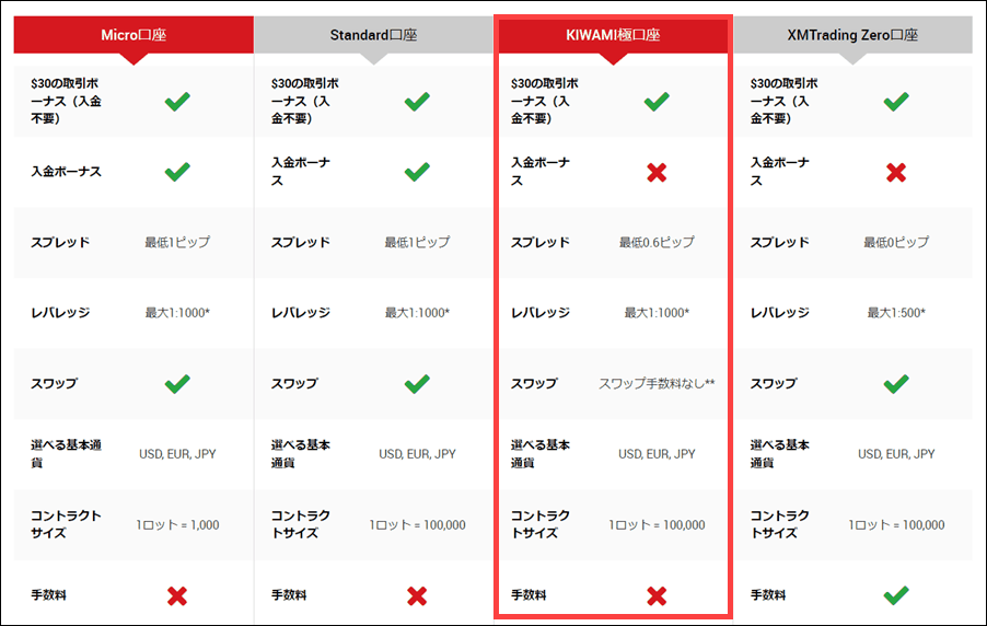 XM | KIWAMI極口座 | スタンダード口座 | ゼロ口座 |