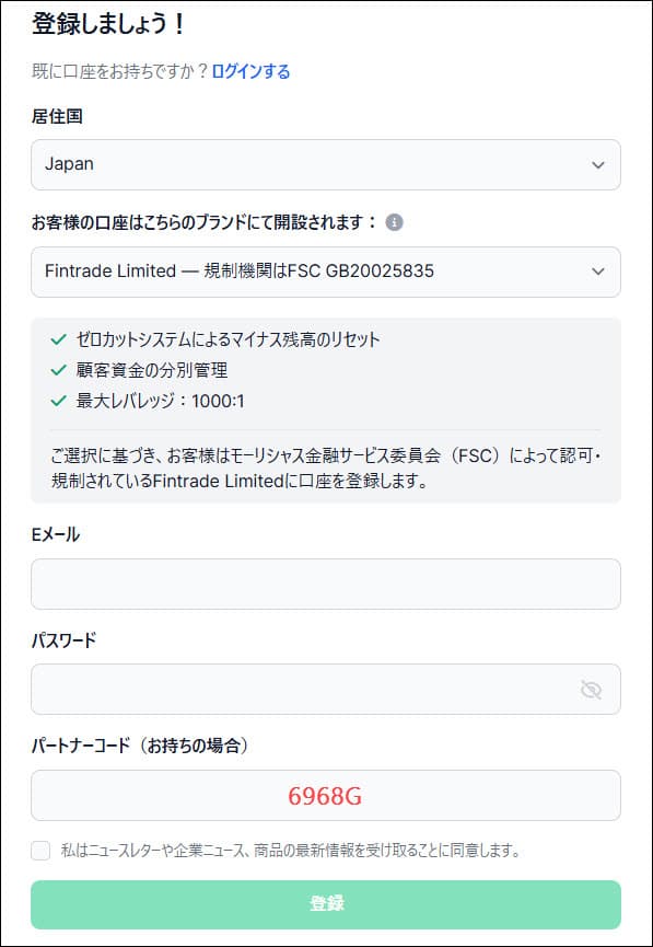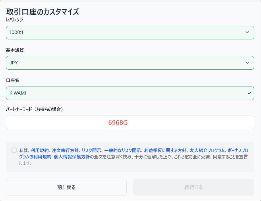 口座開設時にパートナーコードを入力する箇所があるので、パートナーコード”6968G”と入力します。