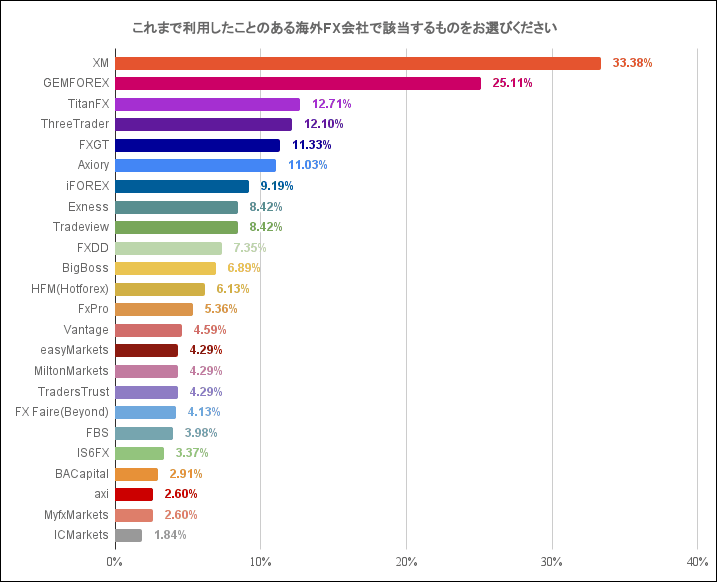 日本国内での海外FX業者のシェアは公開されていませんが、当サイトで独自に653人の海外FXトレーダーに調査をしたところ、XMを使ったことがある人が一番多くなっています。