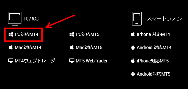 今回はWindows版をダウンロードするので「PC対応MT4」をクリックしましょう。