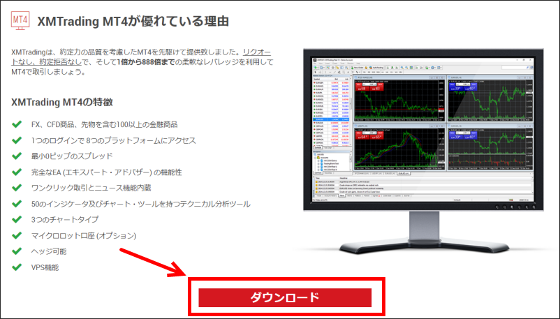 MT4の説明があるので下方の「ダウンロード」をクリックします。