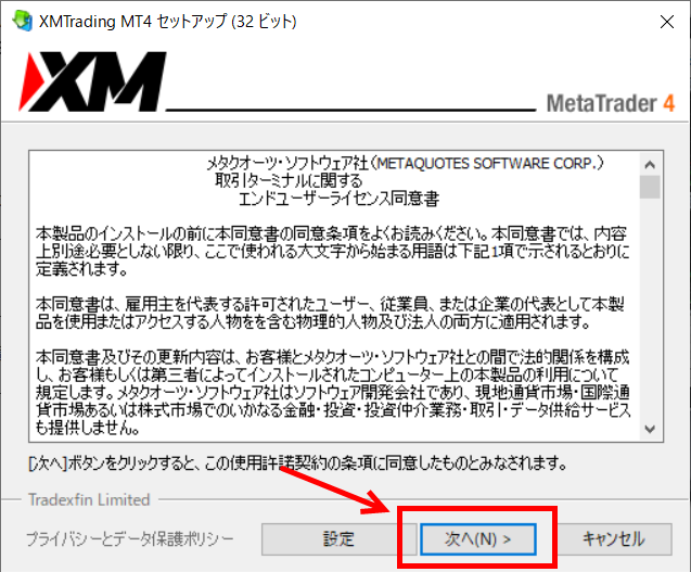 XMのダウンロード画面になるので「次へ」をクリックします。