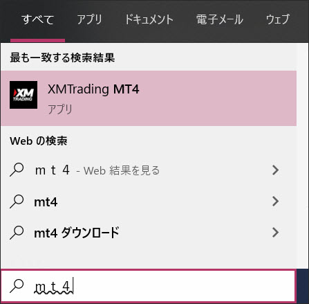 もしショートカットキーが出現しない場合は、デスクトップ左下の検索まどから「MT4」と入力するとXMのMT4が表示されます。
