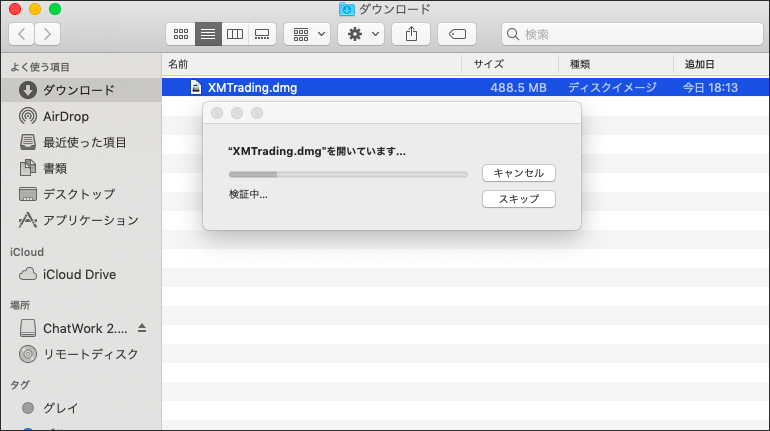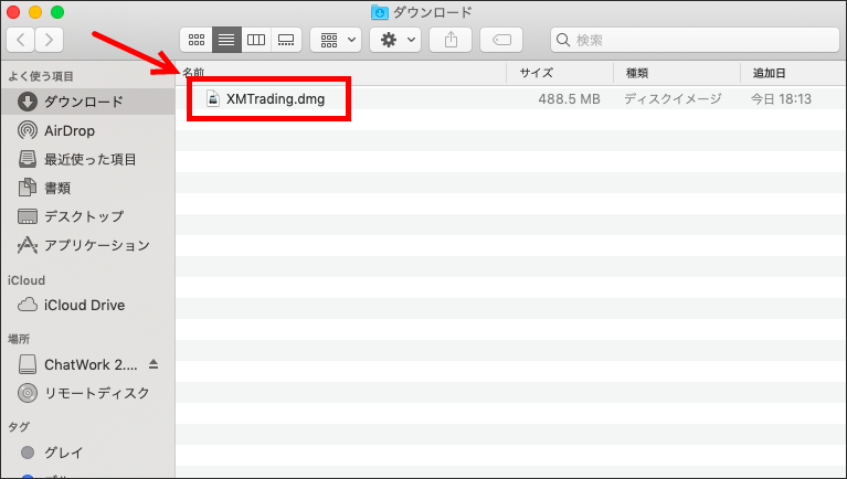 Macのダウンロードファイルの「XMTrading.dmg」をクリックします。