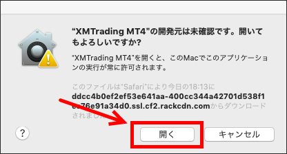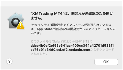 そのままアプリファイルからXMのMT4をダブルクリックで起動しようとすると「開発元が未確認のため開けません」となり、ファイルを開くことができません。