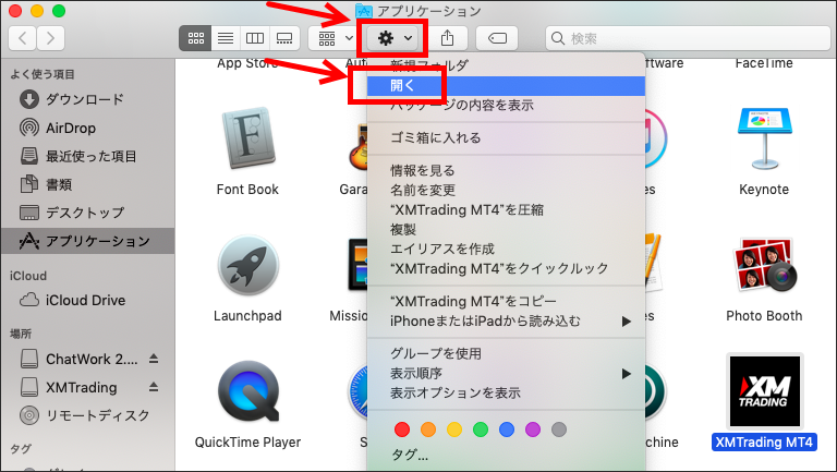 開けない場合は「アプリケーション → 歯車マーク → 開く」をクリックします。