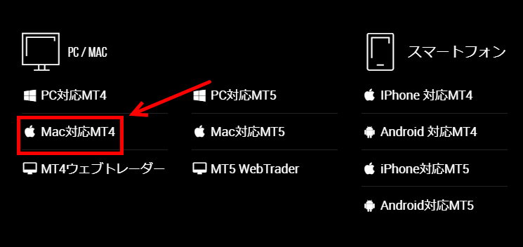 今回はMac版をダウンロードするので「Mac対応MT4」をクリックしましょう。