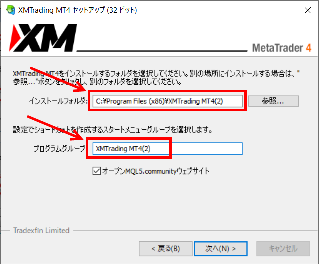 設定画面で「インストールフォルダ」と「プログラムグループ」が変更できるので、「XMTrading MT4」のあとに(2)など、自分の好きな名前を入れましょう。