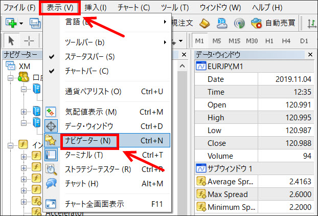 MT4の「表示」→「ナビゲーター」でナビゲーターが表示されます。