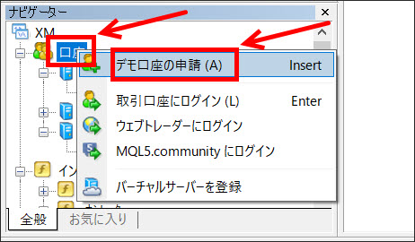 ナビゲーターの口座を右クリック → デモ口座を申請をクリックすると表示されます。