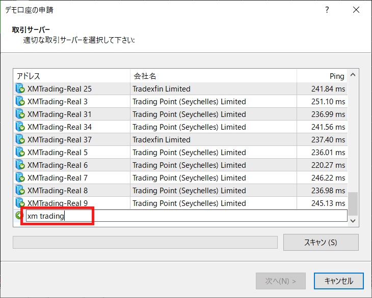 クリックすると入力画面になるので、「xm trading」もしくは「Trading Point」と入力しましょう。