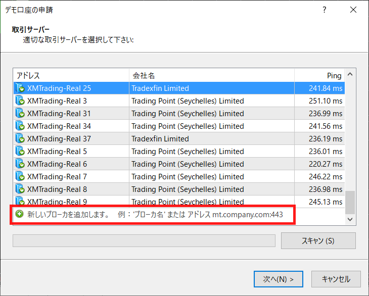 ファイル → デモ口座の申請からスキャンするか、手動で自分のサーバー名を入力して追加してください。