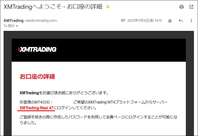 口座開設時のメール「XMTradingへようこそ – お口座の詳細」にサーバー名が記載してありますので、口座開設時のメールが残っている場合はメールで確認が可能です。