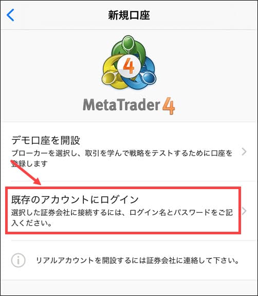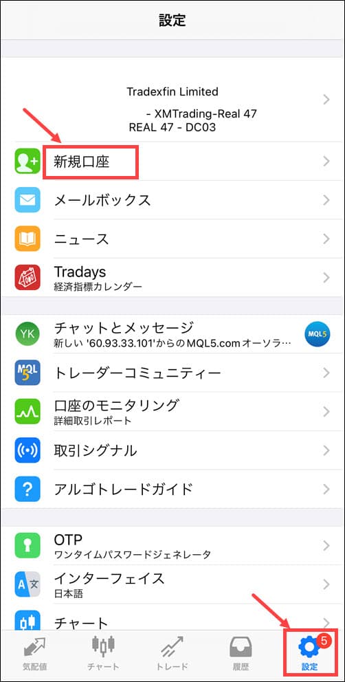 まずMT4アプリを立ち上げて右下の「設定」→「新規口座」を選択しましょう。