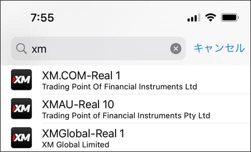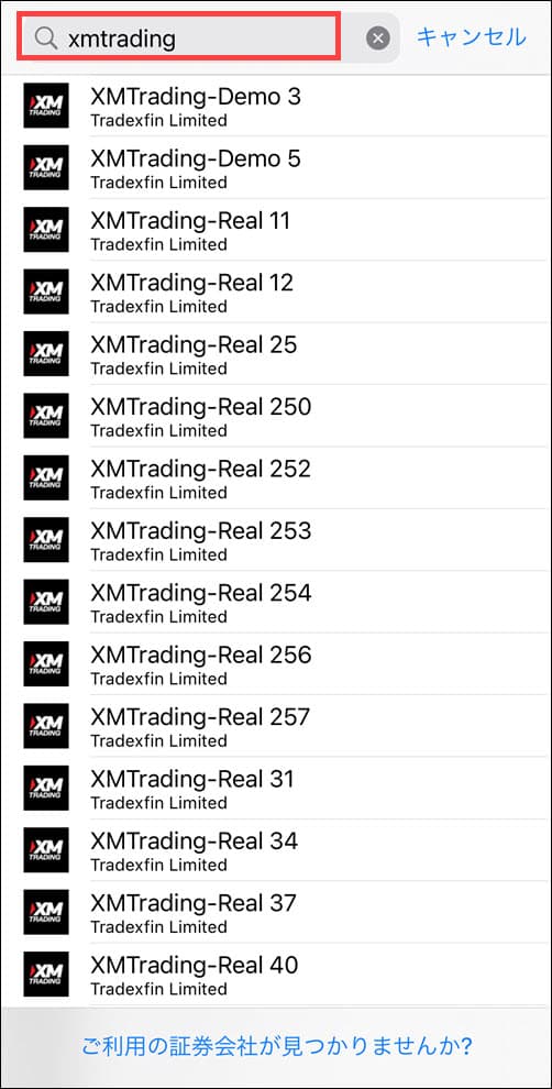検索窓で「xmtrading」と検索すると、XMTradingのサーバー名が表示されるので、自分のサーバー名を選択しましょう。