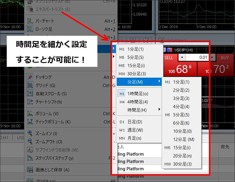 2分足、3分足など、短い時間足が増えたので、スキャルピングなど短期トレードをする人には便利になっています。