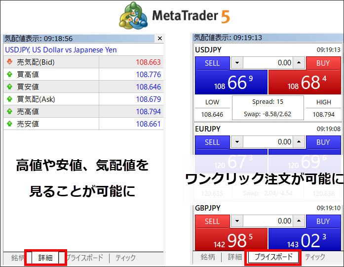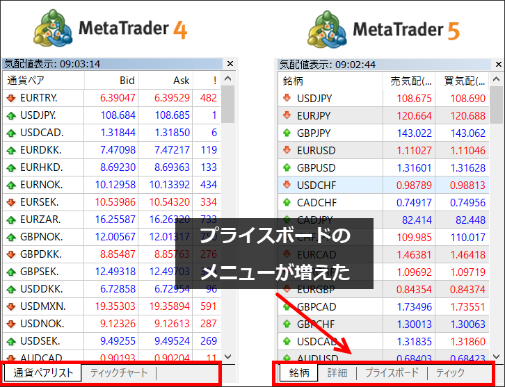 MT4の時は「通貨ペアリスト」と「ティックチャート」の2種類でしたが、「詳細」と「プライスボード」が増えています。