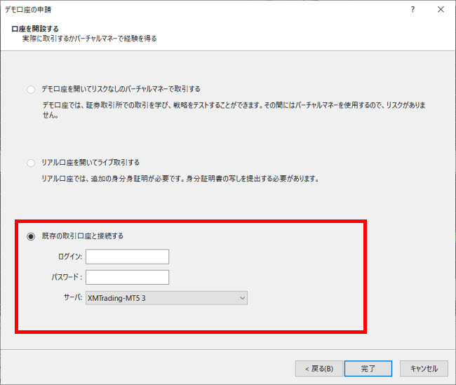 「既存の取引口座と接続する」を選択してログインID、パスワード、サーバー名を入力しましょう。