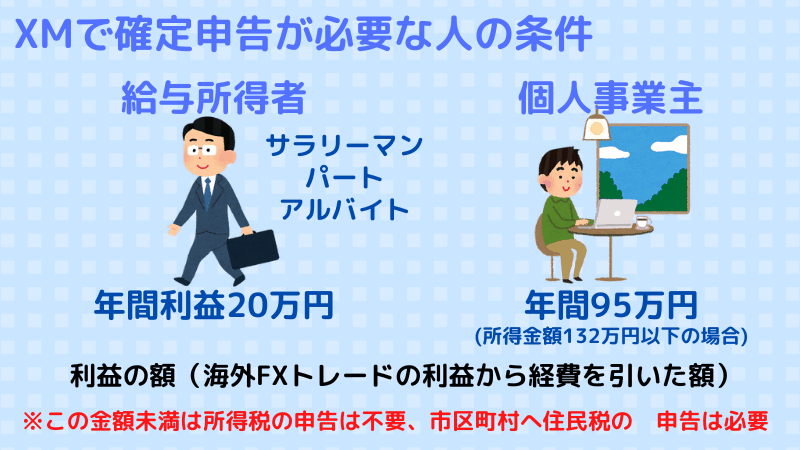 一方で個人事業主の場合は「XMの年間利益が95万円以上」で確定申告が必要です。