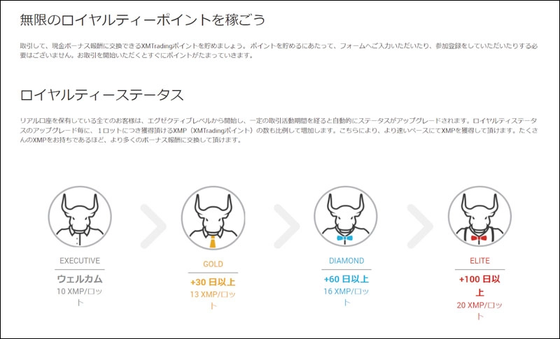 - ロイヤルティステータスは、XMTradingで取引を行うことで獲得できるステータスです。ステータスが高いほど、より多くのXMPを獲得することができます。