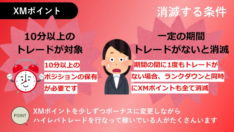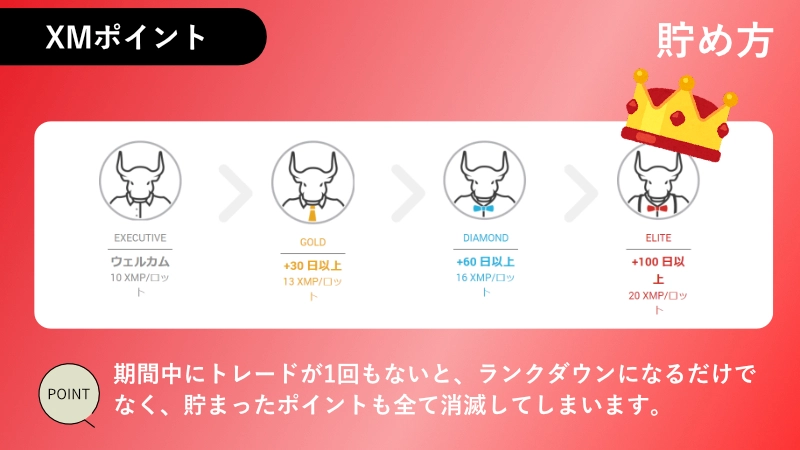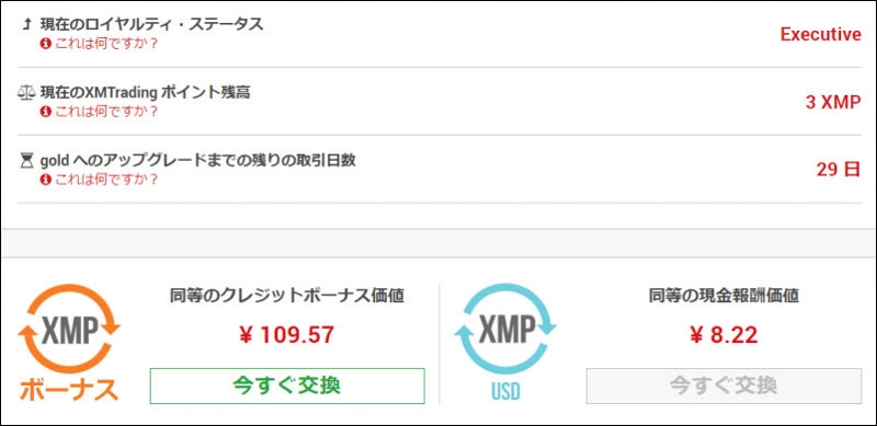 XMポイントは上の期間の間に1度もトレードがない場合、ランクダウンと同時にXMポイントも全て消滅してしまいます。
