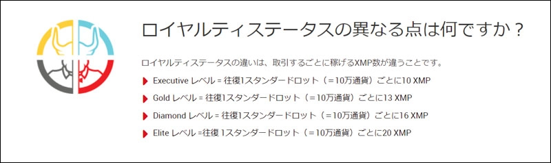 ロイヤルティステータスが高いほど、お取引毎に獲得できるXMPの割合も高くなり、より多くのボーナス報酬を獲得できる仕組みになっています。