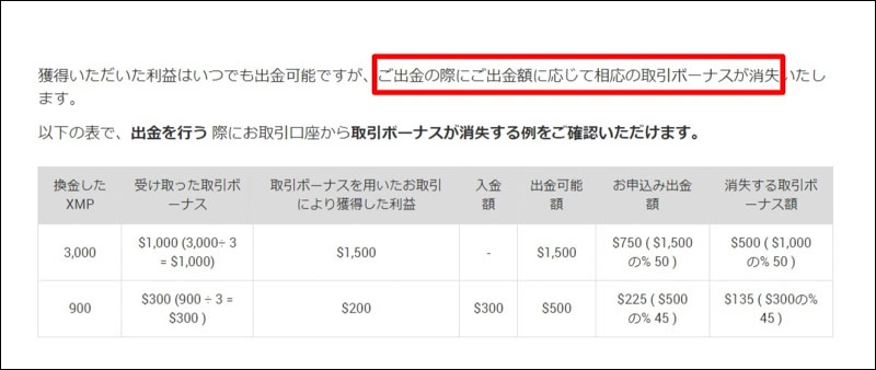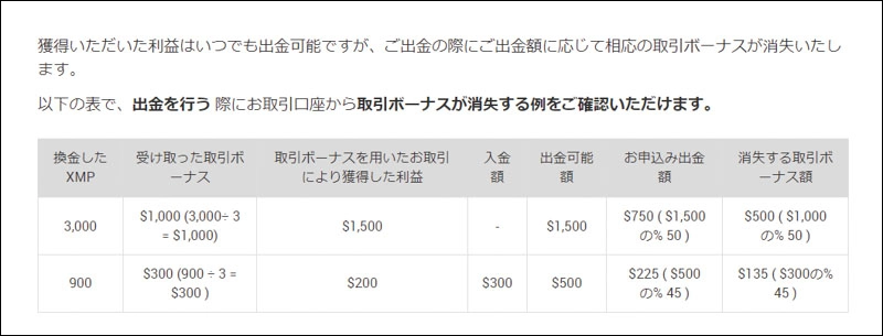 ボーナスに変えた後に口座資金を出金すると、資金と同じ割合のボーナスが消滅します。