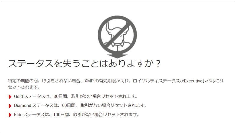 - 一定の期間トレードがないと消滅します。消滅する日数はステータスによって異なります。1ロットでもトレードしていればランクをキープできるので、マイクロ口座で1ロットでもトレードしておきましょう。