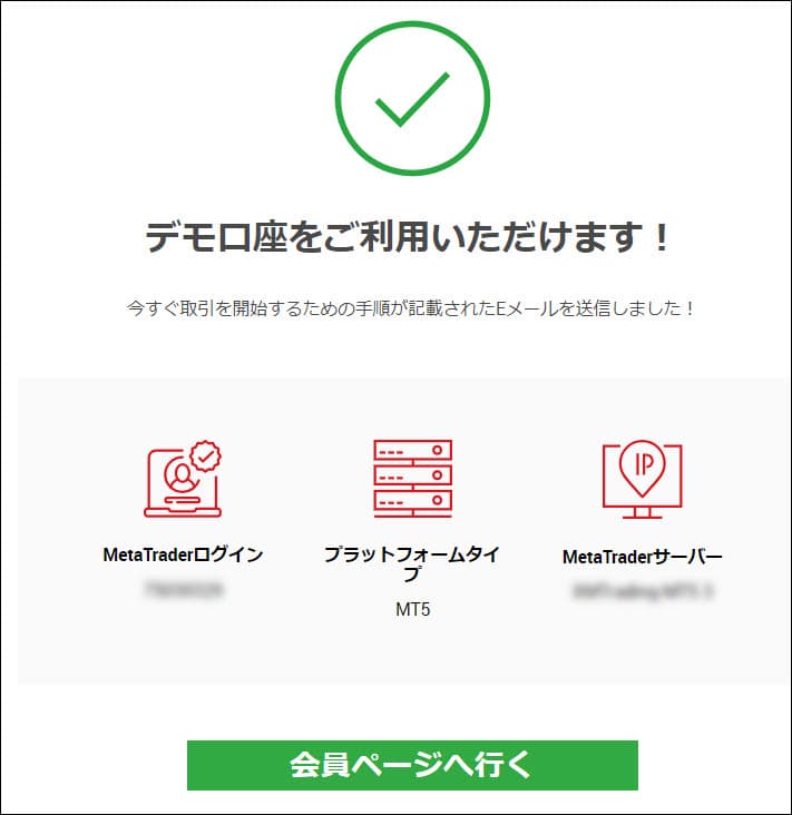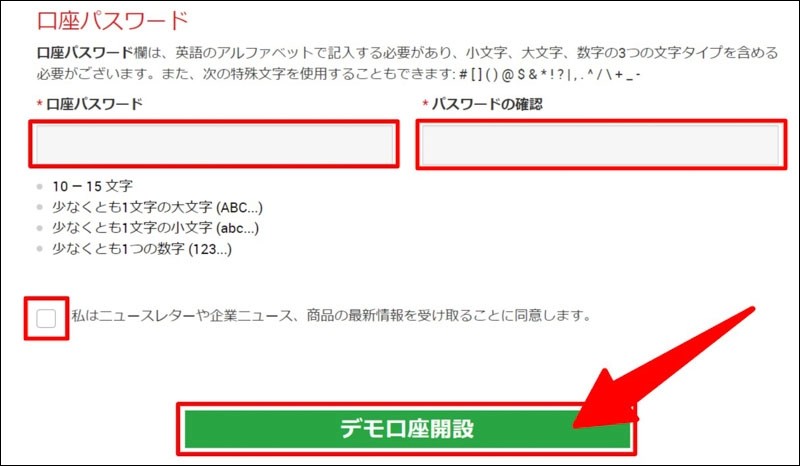 ”私はニュースレターや企業ニュース、商品の最新情報を受け取ることに同意します。”の部分に受け取りたい場合はチェックを入れて、最後に「デモ口座開設」をクリックしましょう。