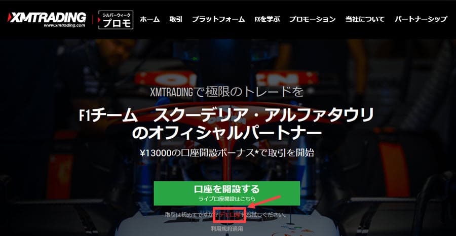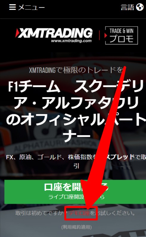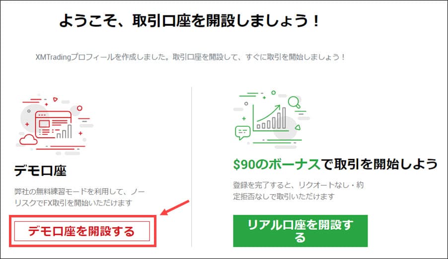 XMの公式サイトのトップページに「デモ口座開設」という赤いボタンがあるのでクリックします。