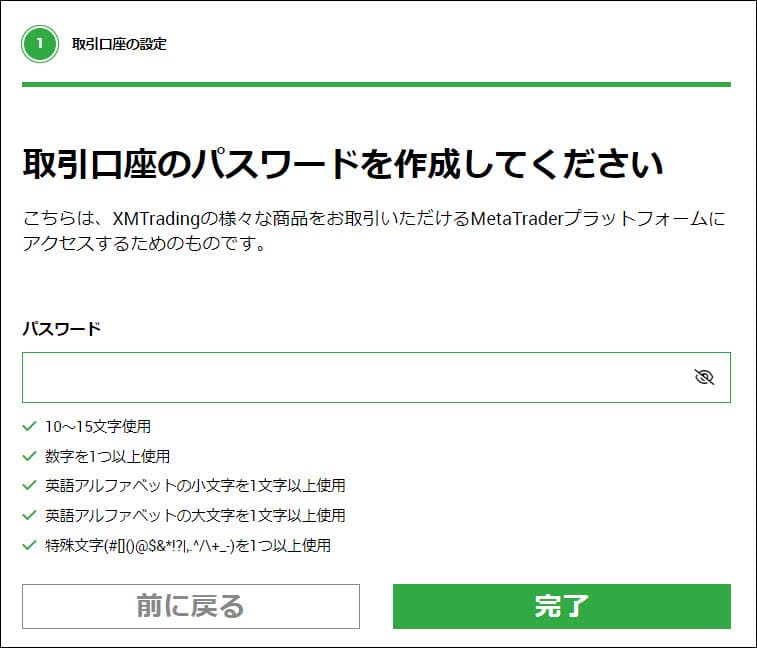 口座のパスワードは「小文字、大文字、数字、記号」の4種類が必要です。