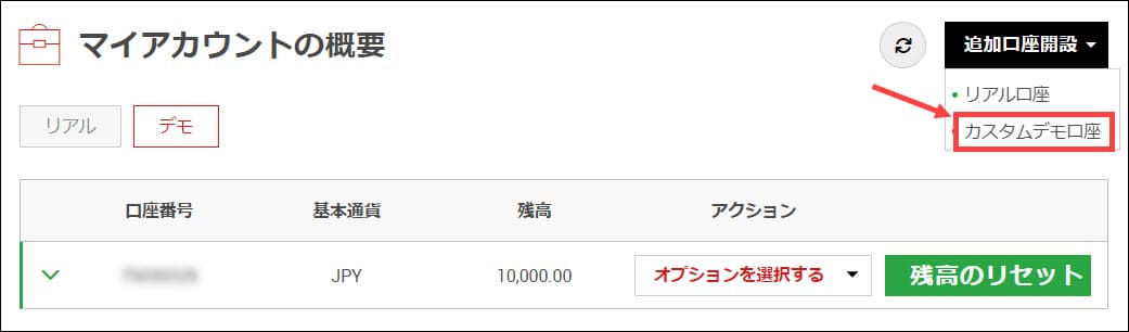 もし残高の上限を増やしたい場合は、カスタムデモ口座から上限の高い口座を作りましょう。