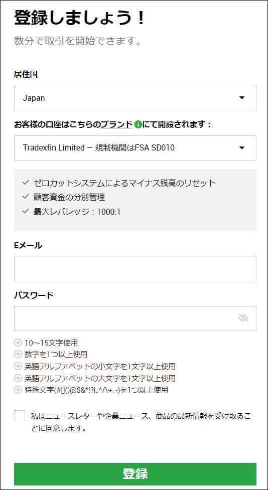 ”私はニュースレターや企業ニュース、商品の最新情報を受け取ることに同意します。”の部分に受け取りたい場合はチェックを入れて、最後に「デモ口座開設」をクリックしましょう。
