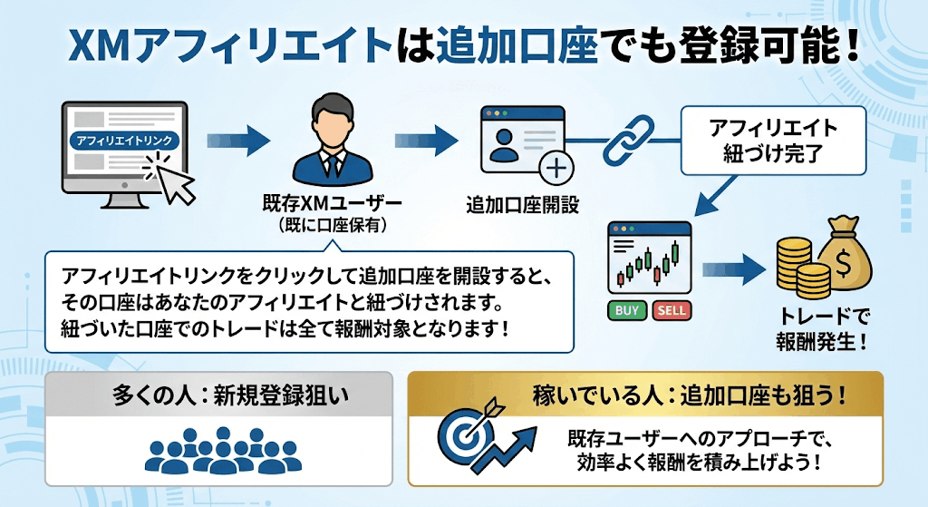 XMアフィリエイトは追加口座でも登録することができ、報酬を得ることができます。