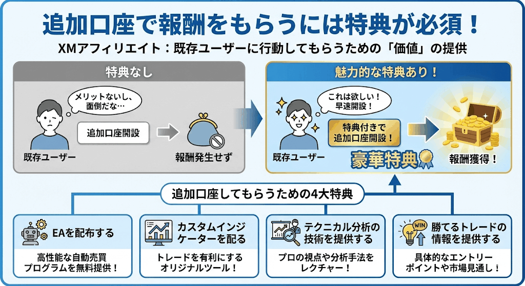 XMアフィリエイトを追加口座してもらい報酬を得るためには、それなりの特典などがないと追加口座してくれません。