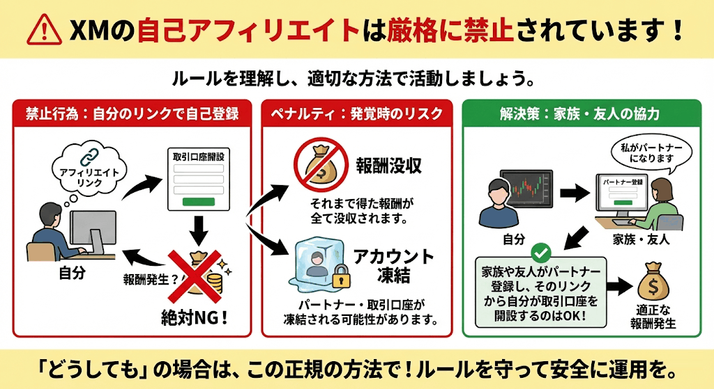 XMでは「自分で自分のアフィリエイトリンクを使った」自己アフィリエイトが禁止されています。