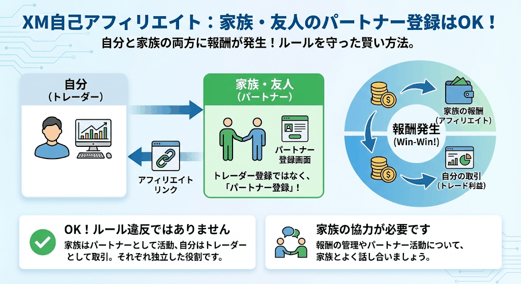 XMでは「自己アフィリエイト」は禁止されているものの、「家族や友人の登録によるアフィリエイト」はOKです。