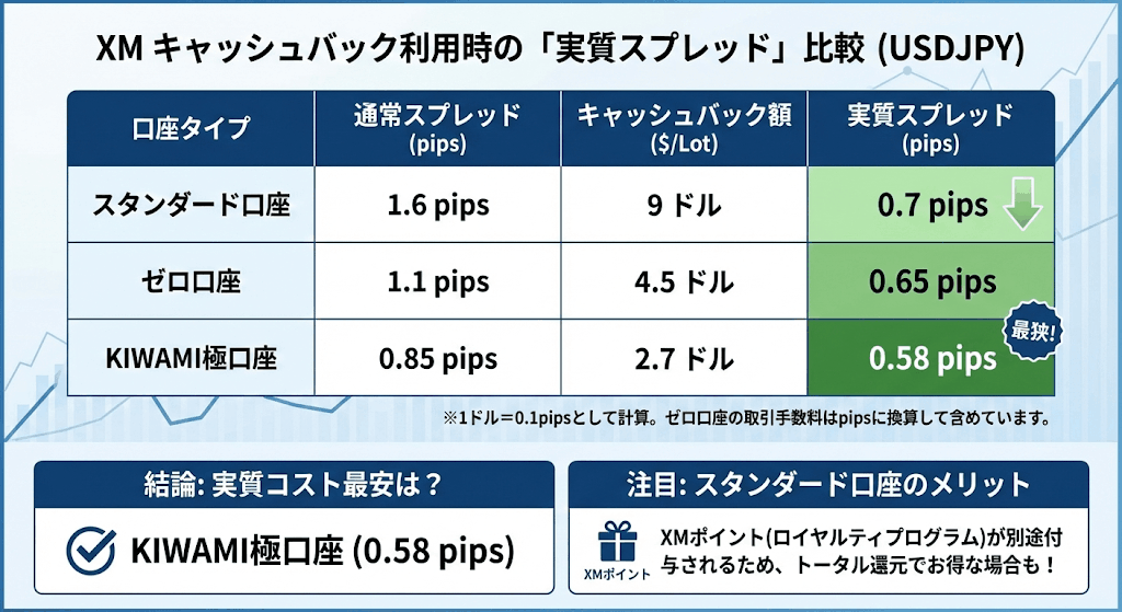 KIWAMI極口座の実質スプレッドが一番狭いですが、スタンダード口座はXMポイントがもらえるので、スタンダード口座でキャッシュバックを受け取るのも良いと思います。
