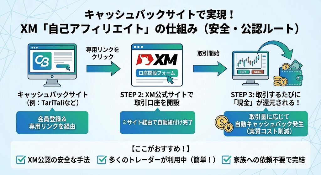 海外FXではキャッシュバックサイトと呼ばれる自己アフィリエイトを簡単にできるサービスがあり、キャッシュバックサイト経由でXMに口座開設をすると簡単に自己アフィリエイトをすることが可能です。