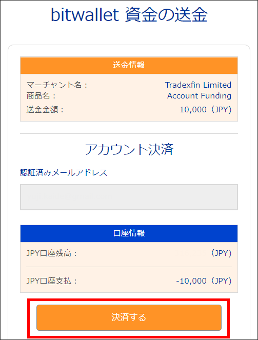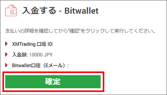口座IDや入金額、Bitwalletのアドレスを確認して「確定」をクリックします。