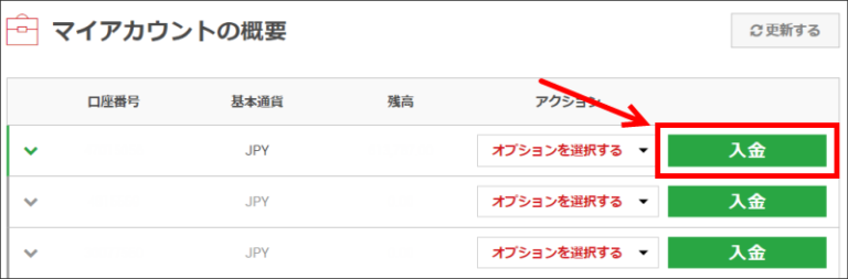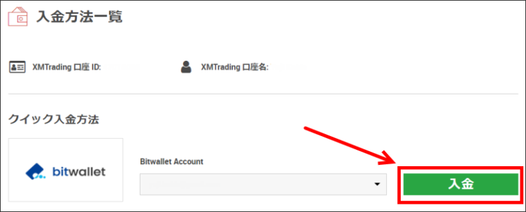 XMの入金一覧が表示されるので、Bitwalletの箇所になる「入金」をクリックしましょう。