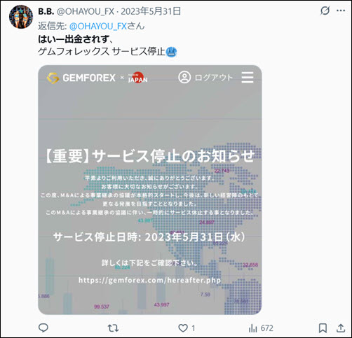 GEMFOREXは顧客資金を持ち逃げしてサービス停止をした業者で、おそらく最大規模の詐欺・横領事件です。