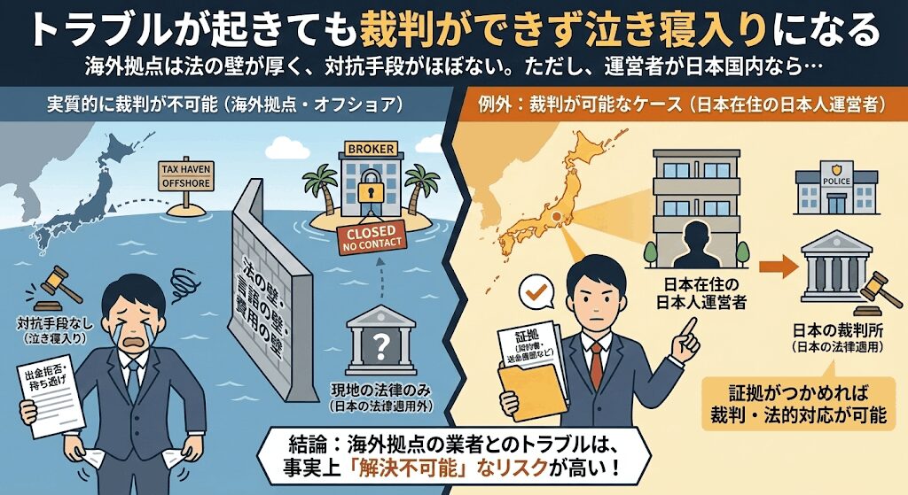 海外FX業者の拠点はオフショア国(タックスヘイブンの国)が多く、何かトラブルがあって裁判をする時はFX業者の拠点となる国で裁判をする必要があります。
