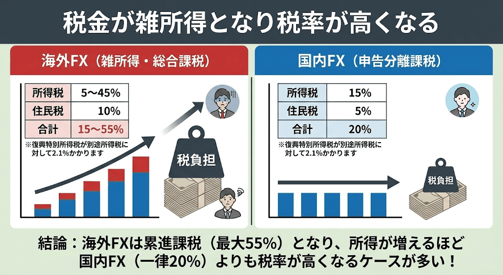 所得金額にもよりますが、全体的には国内FXよりも税率が高くなるケースが多いです。
