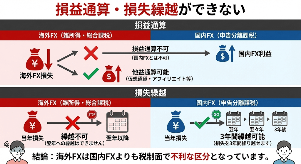 海外FXは「総合課税の雑所得」に分類されるので、国内FXとの損益通算(損失と利益を相殺すること)はできません。