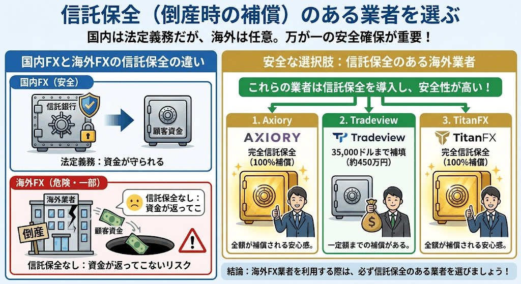 海外FX業者を利用する時は、信託保全のある業者を利用するようにしましょう。