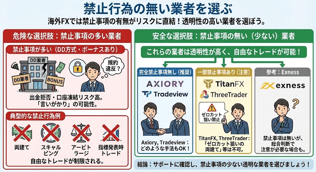 海外FXでは禁止事項の多い業者と禁止事項の無い業者があります。